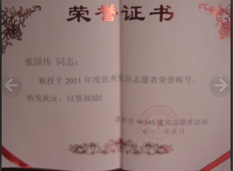 我所张国伟律师被嘉兴市96345党员志愿者总站授予“2011年度优秀党员志愿者”荣誉称号!