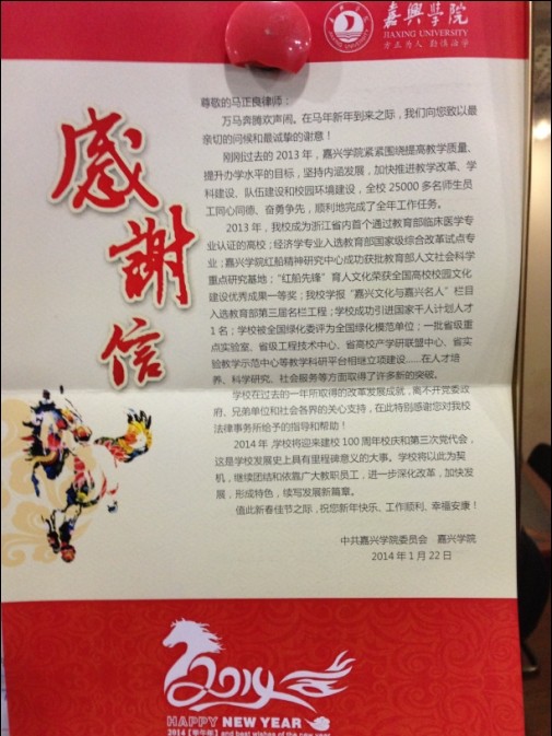 2014年1月22日,我所马正良律师收到一封来自中共嘉兴学院委员会、嘉兴学院的感谢信。信中提到,嘉兴学院2013年在人才培养、科学研究、社会服务等方面取得了许多新的突破,特别感谢我所马正良律师对嘉兴学院法律事务所给予的指导和帮助。